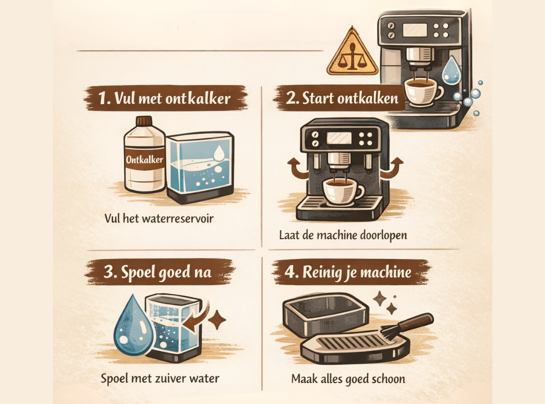 Je vult het waterreservoir met een ontkalkingsoplossing en laat deze door de machine lopen. Daarna spoel je alles grondig na met schoon water, zodat er geen resten achterblijven.